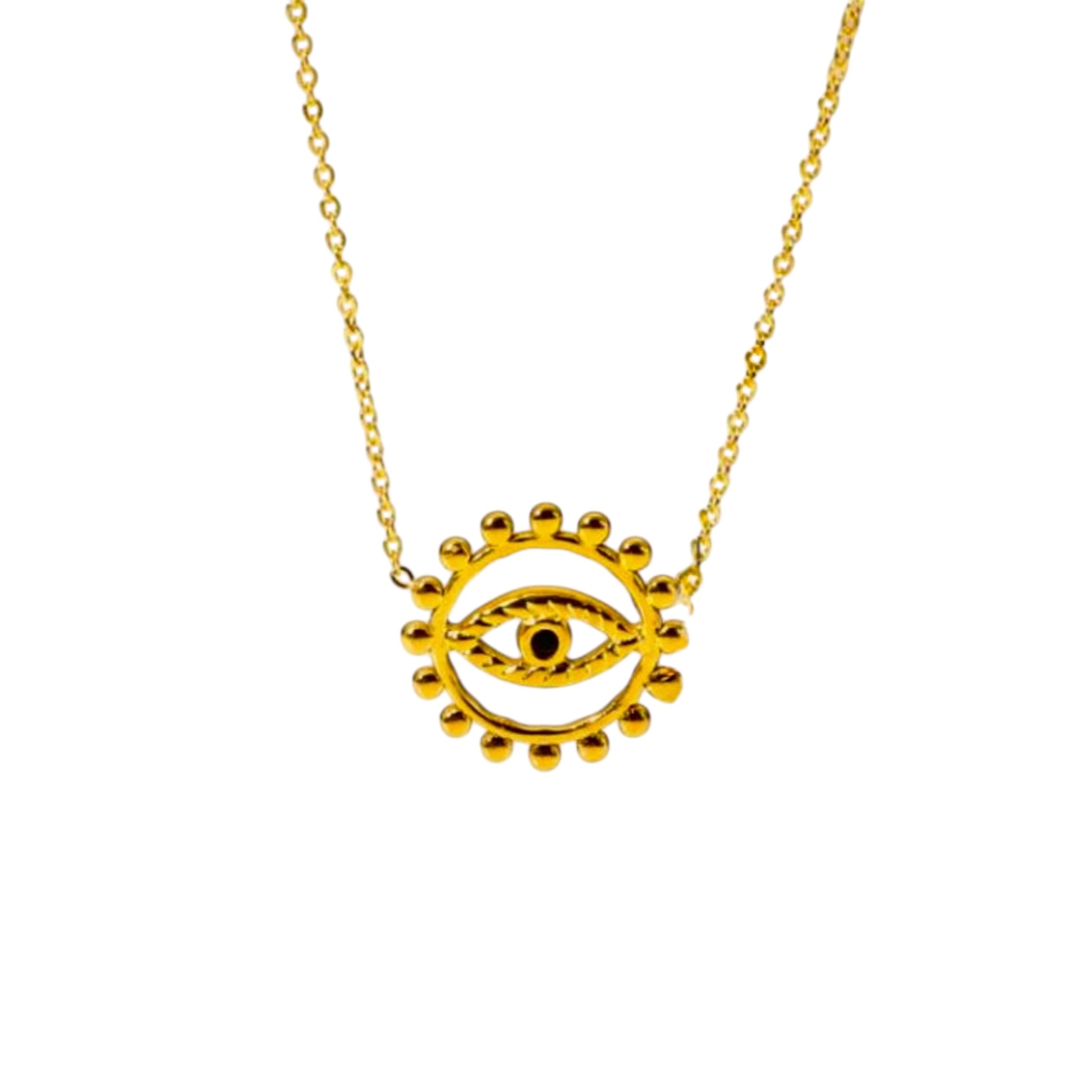 Elevate your style with the Evil Eye Halo Necklace — a bold yet refined design inspired by spiritual symbolism. Featuring a captivating evil eye motif framed by bead-like accents that form a radiant halo, this necklace embodies both meaning and modern elegance. Perfect solo or layered, it’s a statement of both protection and polished style.