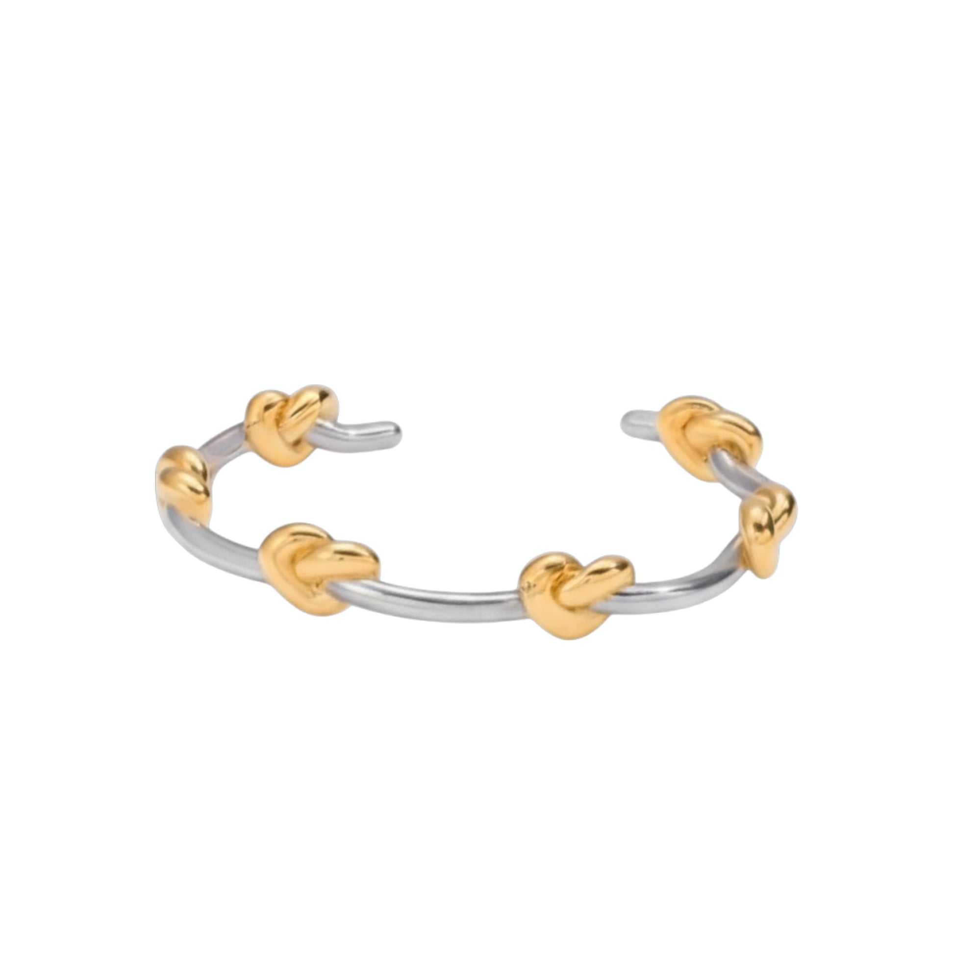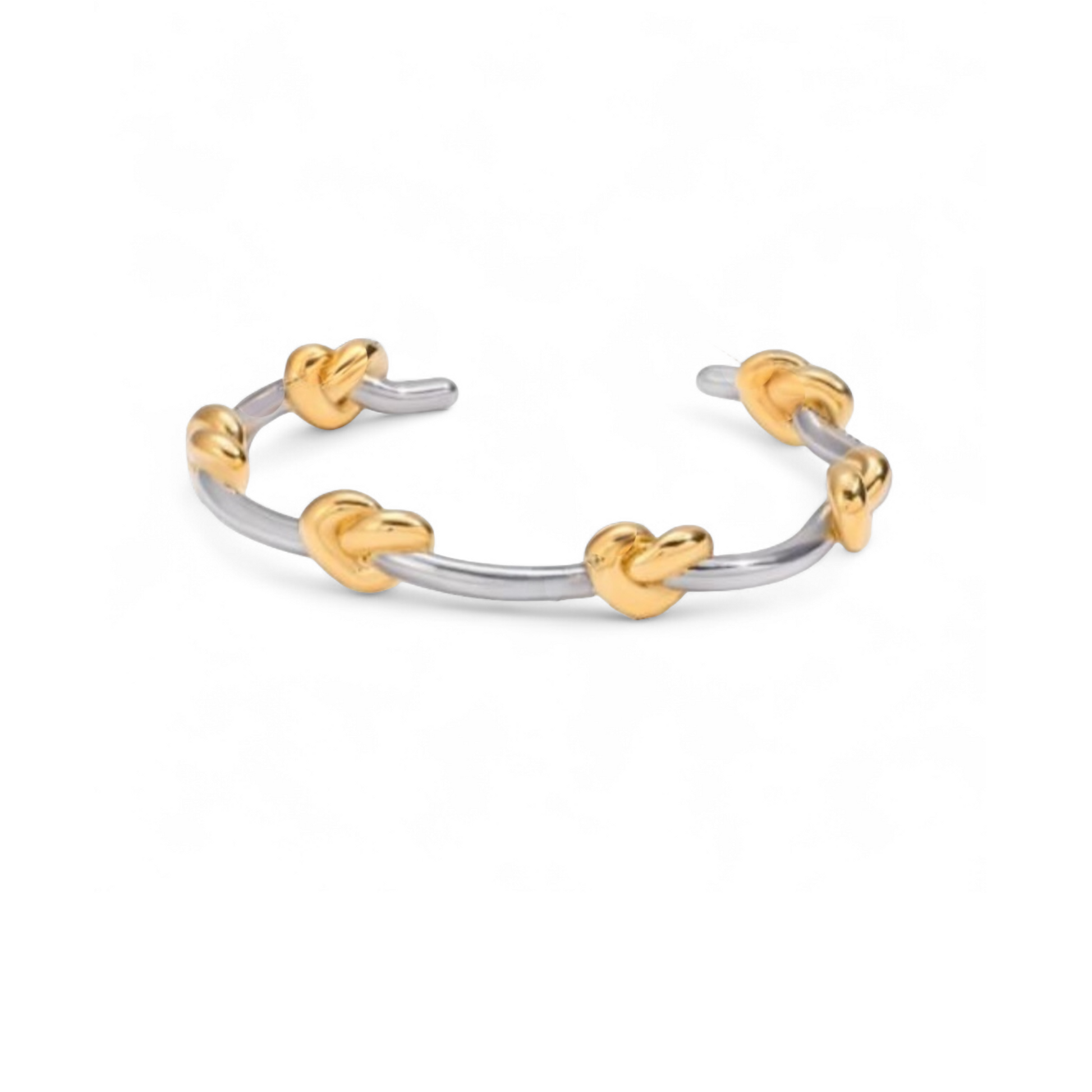 The Two Tone Multi Knot Bracelet features golden knots along a sleek silver-tone band — a versatile cuff that blends symbolism with everyday elegance.